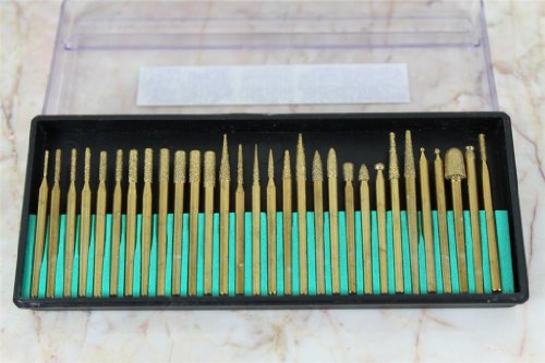 New one box set of 30 pcs TITANIUM diamond coated grinding burr set. There are some sphere, cylinder, bullet, or needle sharp. 1/8" (3mm) shank and 1 3/8" shank length. TITANIUM coated with PREMIUM grade diamond sand. Grit 120. More durable than the ordinary diamond coated burr. Suitable for use in grind the edge of glass, marble or rock. Come with the case as shown on picture with cover.